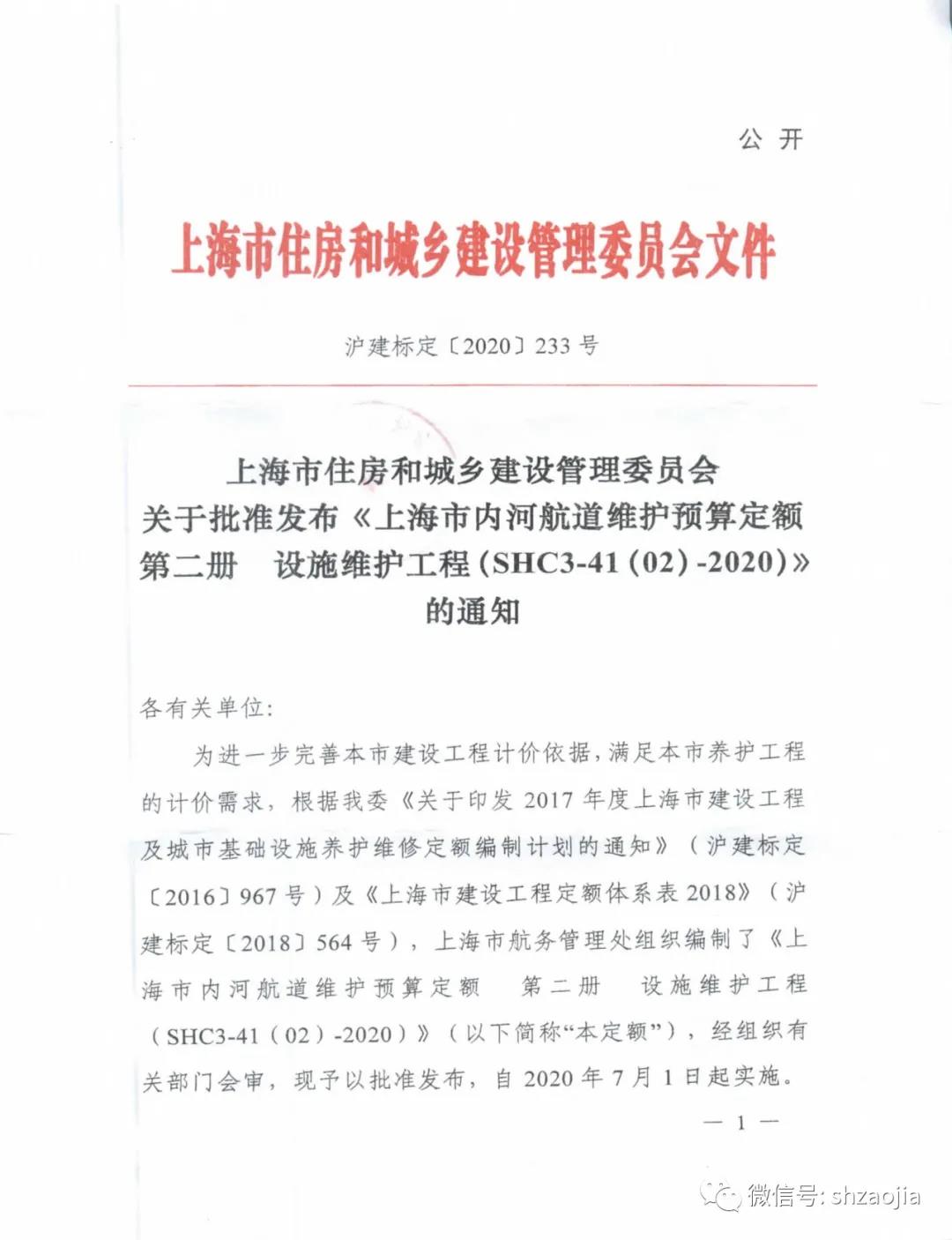上海市住建委关于批准发布《上海市内河航道维护预算定额第二册 设施维护工程(SHC3-41(02)-2020)》的通知